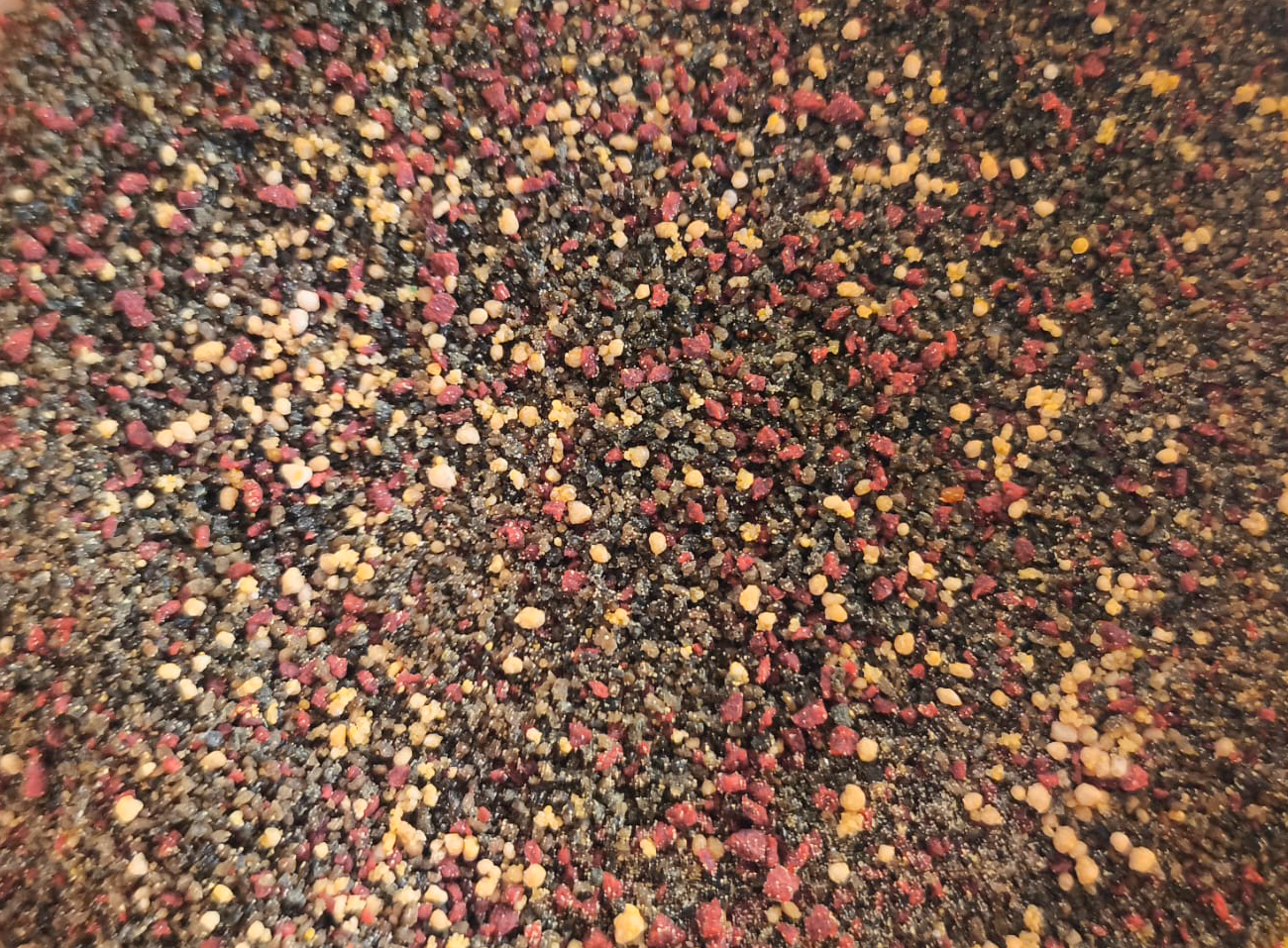 O granulado red é produzido à base de proteinas e enriquecido com ácidos gordos e algas ricas em carotenoides que ajudam na acentuação das cores devido à presença de astaxantina (corante natural).