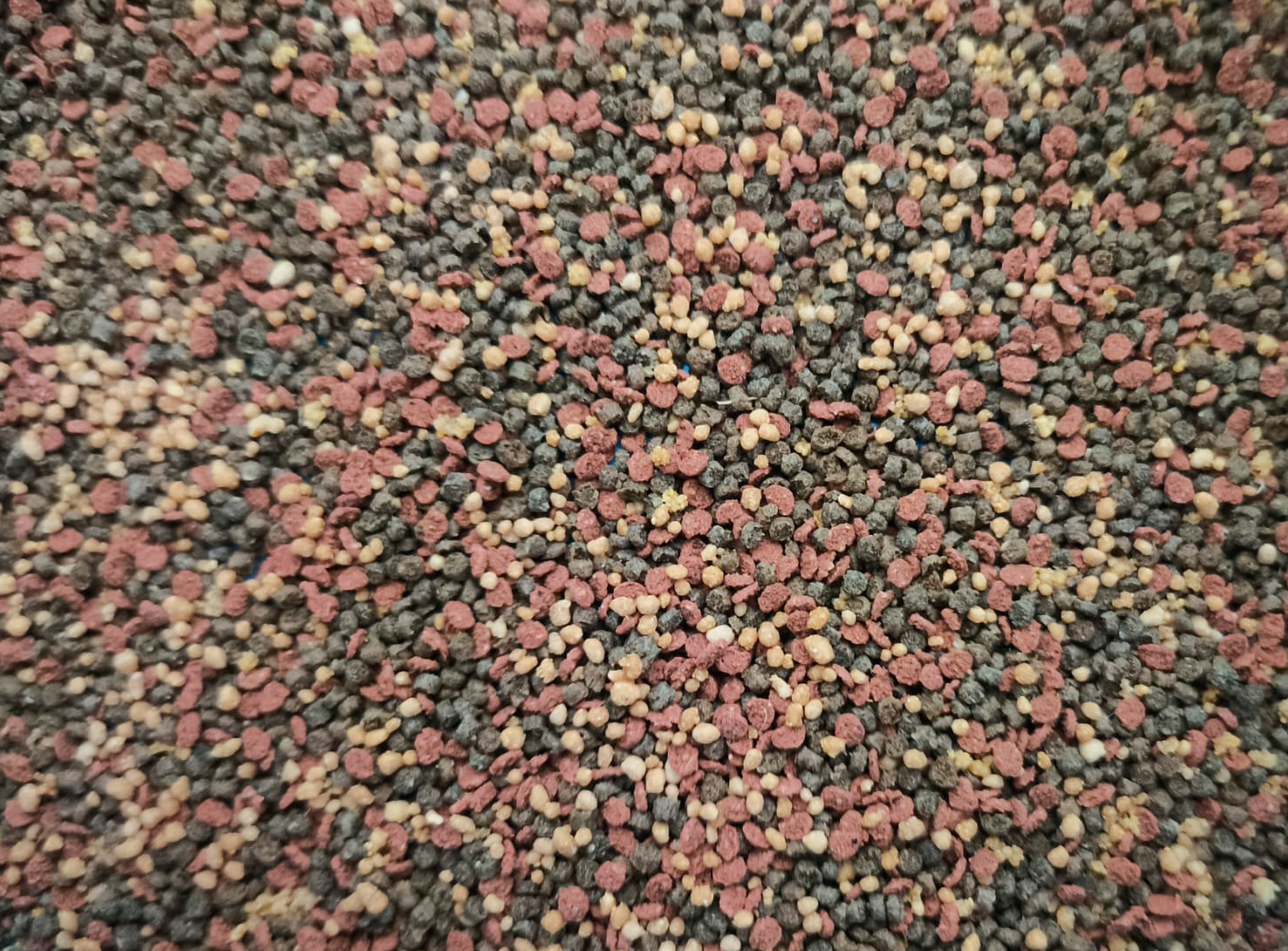 O granulado red é produzido à base de proteinas e enriquecido com ácidos gordos e algas ricas em carotenoides que ajudam na acentuação das cores devido à presença de astaxantina (corante natural).